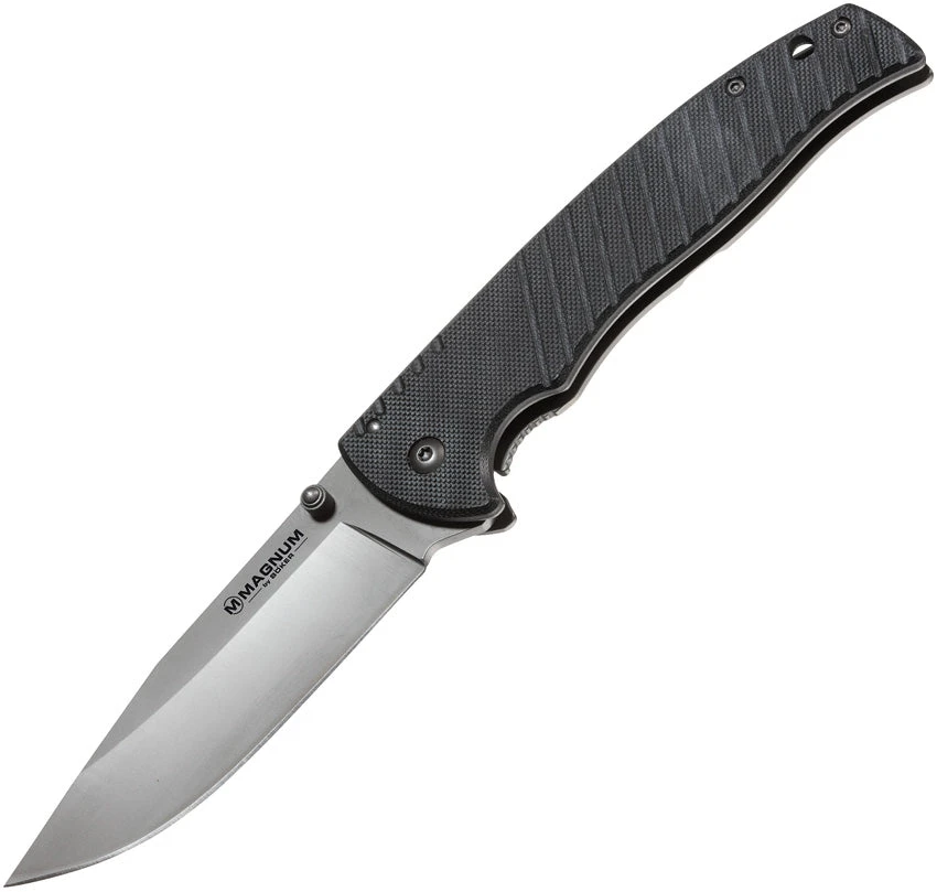 Assisted opening. 5″ closed. 3.75″ satin finish 440A stainless blade. Lanyard hole. Pocket clip. Thumb stud. Black G10 front handle with satin finish stainless back handle. Boxed.