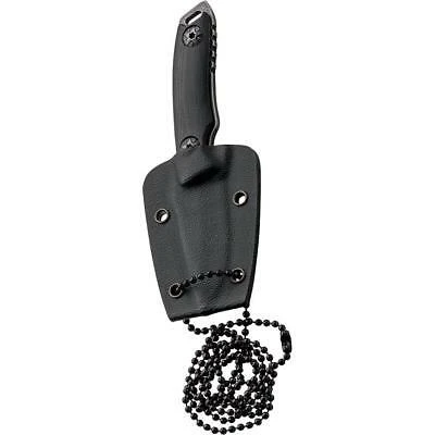 4.63″ overall. 1.75″ black stonewash finish 440 stainless clip point blade. Black G10 handle. Lanyard hole. Full, extended tang. Black Kydex neck sheath. Boxed.