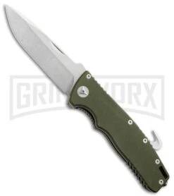This is a very impressive and resilient pocket knife. The sharp 440 steel blade locks securely with the liner lock in the open position. Additionally, the finger groove prevents slipping on the cutting edge, and because of the ergonomics of the grip design and green G10 handle scales, the knife fits comfortably in hand. The folding belt cutter and glass breaker are designed for emergency use, and the knife features a pocket clip and lanyard hole.