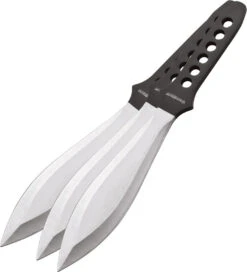 Includes three 10 1/4″ overall throwing knives with 6″ double edged blades. One piece 420 stainless construction with black coated handles and drilled hole design. Black leather belt sheath holds all knives.