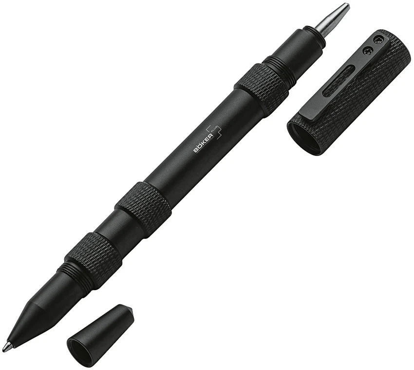 6.5″ overall. Aluminum construction. Black. Weighs: 1.8oz. The Boker Plus Recoil Commando Pen designed by David Cyr and Kevin Passon has a spring punch secured under the front cap. In an emergency, it can be used to break glass in a safe and controlled way. Unlike other glass breakers, it doesn’t have to hit the glass with force but is simply placed on the glass pane and pressed into it. The spring inside the pen is tensioned, which multiplies the exerted force. When the tip is recoiled deep enough into the pen, it shoots out again, breaking the glass. Without swinging a tool against the glass, the injury risk is significantly lower and the glass shatters in a more controlled way. In contrary to conventional glass breakers, the Recoil Commando Pen can also be used under water without much effort. The fluted black handle is made from lightweight aluminum and has a very pleasant grip. For writing, the back cap is removed from the precise thread and placed in front, so the pen can be turned. With the sturdy clip, the Tactical Pen is always at hand. It is compatible with Lamy M-22 refills.