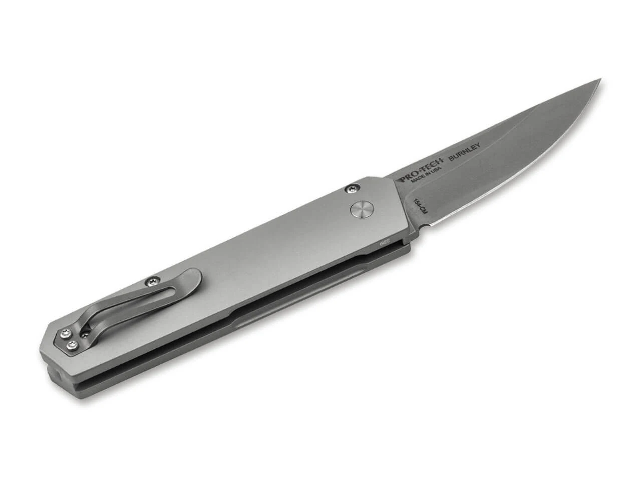 Automatic opening. 4.06” closed. 3.07” Stonewash finish 154CM stainless steel blade. Flat Grind. Gray aluminum handle. Button Lock. Tip-Up right carry pocket clip. Designed by Lucas Burnley. Boxed.