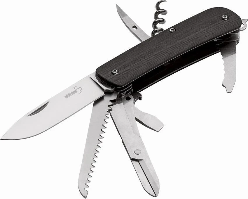 3 5/8″ closed. 2 3/4″ 12C27 Sandvik steel blade with nail nick. Tools are 4Cr13 stainless and include glass breaker, screwdriver with bottle opener and wire stripper, small serrated blade with screwdriver tip, corkscrew, foldable lanyard hole, scissors, wood saw, and punch/awl. Black G-10 handles. Stainless pocket clip.